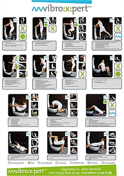 Este cartel muestra una serie de ejercicios útiles para el entrenamiento sobre una plataforma vibratoria o las máquinas de la marca Power Plate.